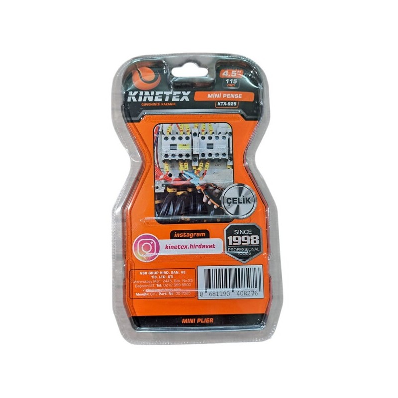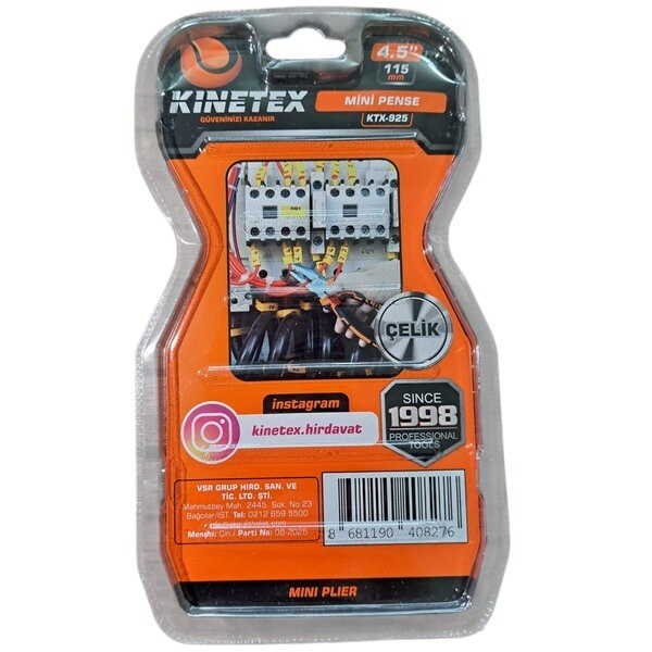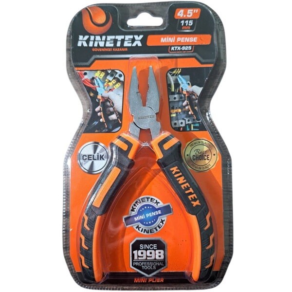 Kınetex KTX-925 Mini Pense, 115mm uzunluğunda, hassas tutma ve bükme işleri için tasarlanmış, ergonomik saplı ve yüksek dayanıklılığa sahip profesyonel bir el aletidir.